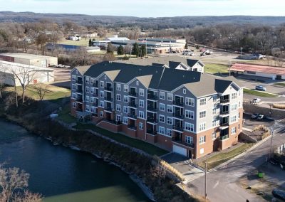 This structure once completion has taken place will consist of 66 units, encompassing an overall total of 112,000 square feet, 2 levels of underground parking, 4 stories of apartment living, a workout room, and a community room, which will be connected to a patio overlooking the Baraboo River (with natural gas grills on the patio). Some finishing touches are being finalized inside, but many of the units are already occupied. The building site has a huge grade shift from front to back, which required some uncommon building techniques.
